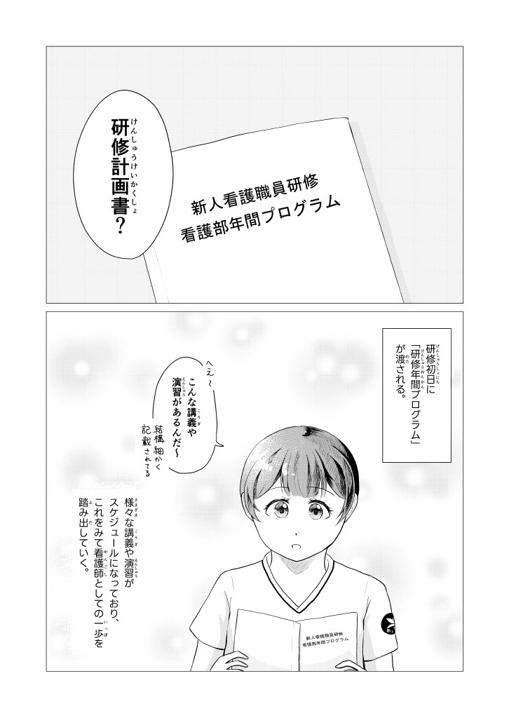 新人研修の様子や配属部署での様子、プリセプターや同期スタッフとの関りなど、入職後の1年をイメージできるような内容になっています。